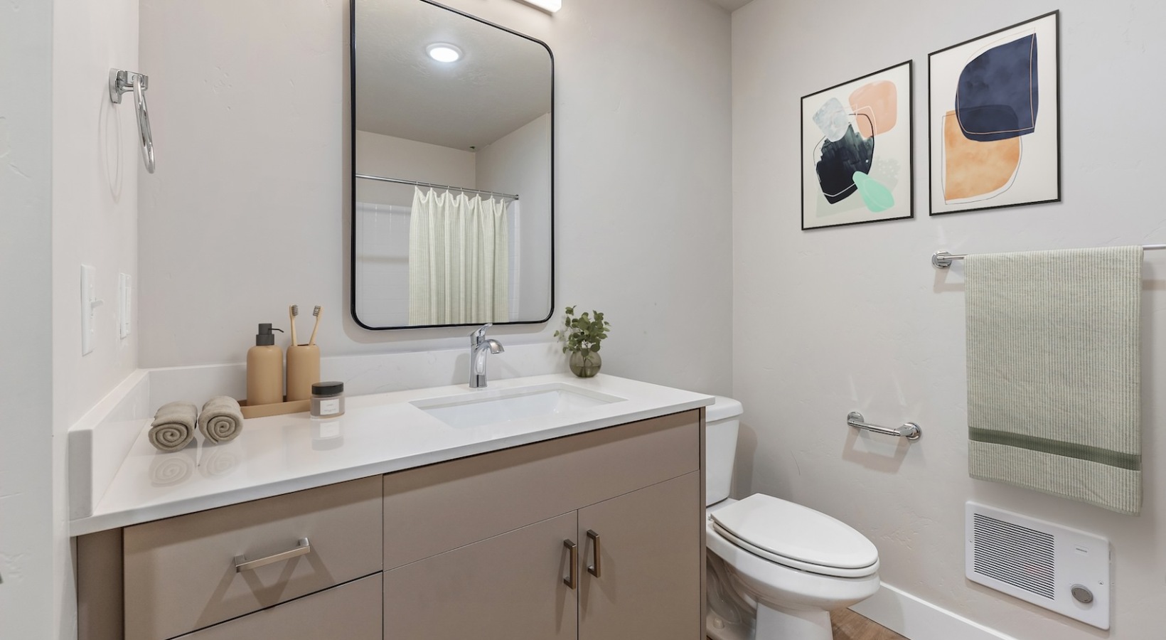 • a spacious bathroom with a large mirror